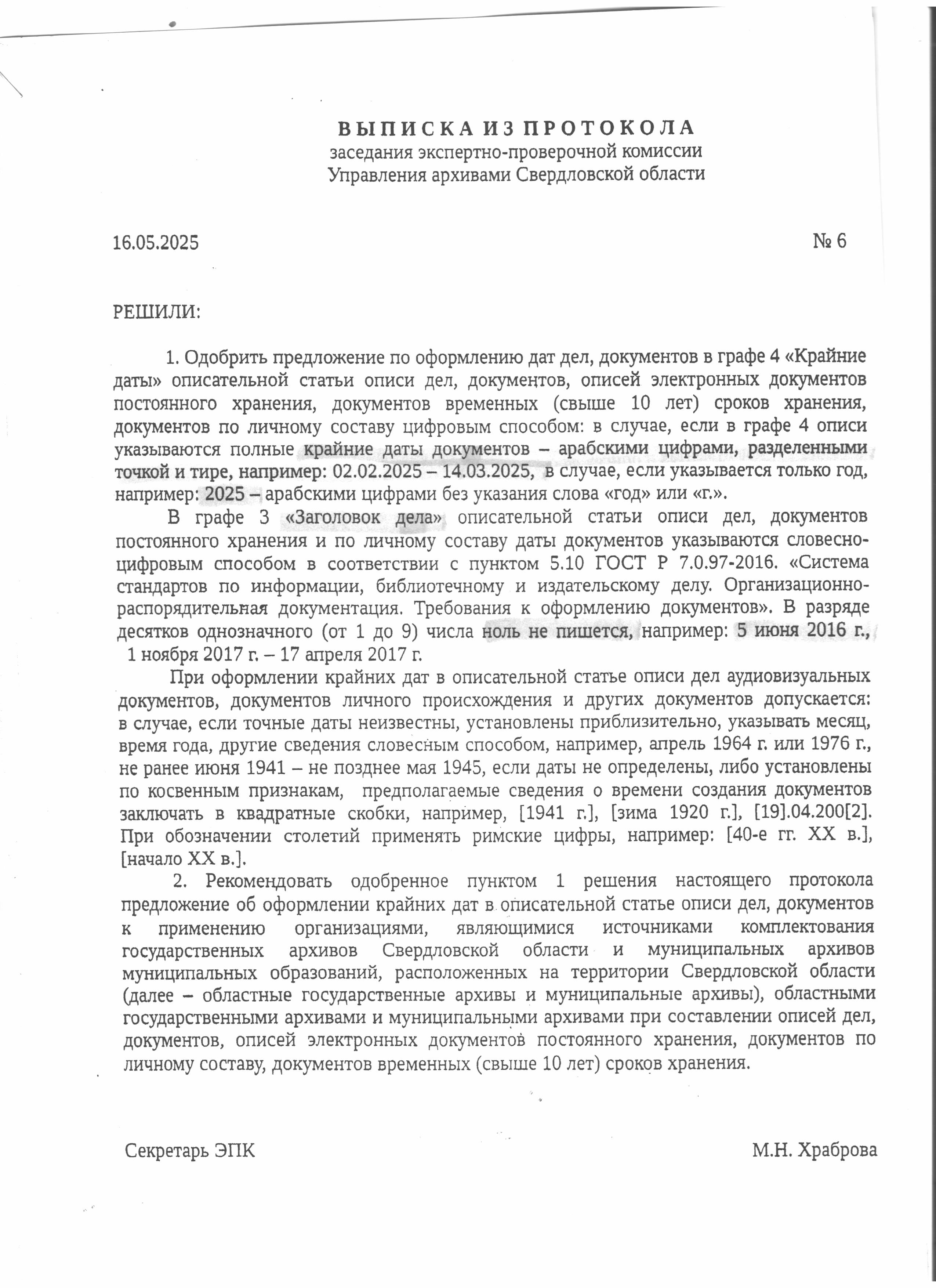 Выписка из протокола заседания экспертно-проверочной комиссии Управления архивами Свердловской области от 16.05.2025 № 6