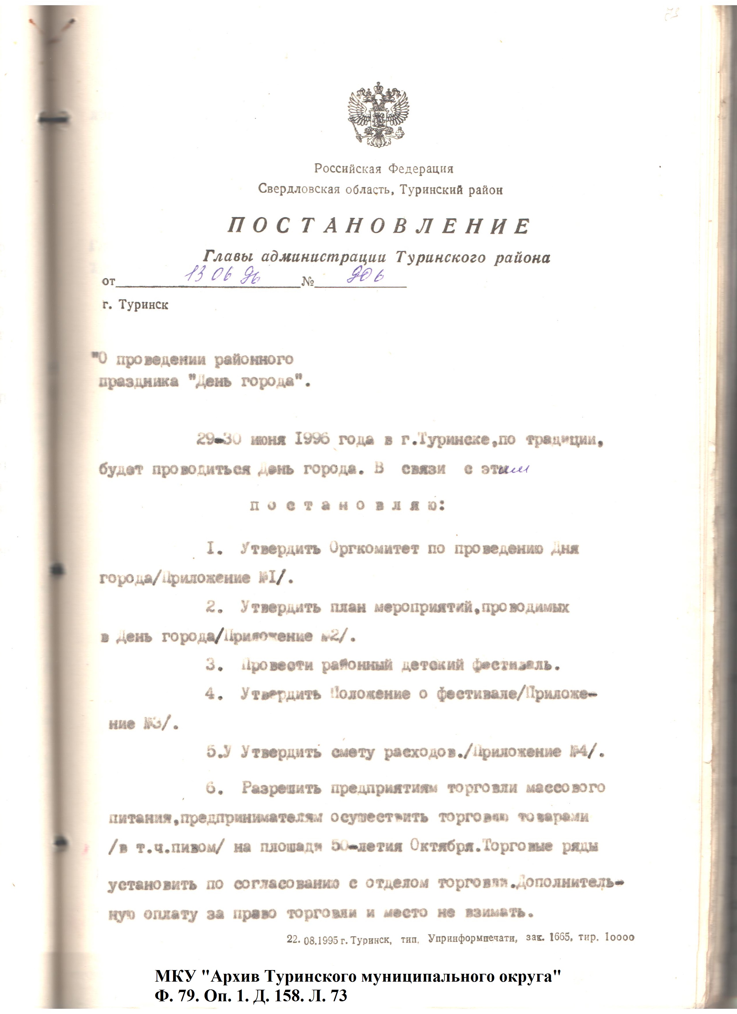 ♦ В соответствии с постановлением главы администрации Туринского района от 13.06.1996 № 906 «О проведении районного праздника «День города», было решено проводить День города в последнюю субботу июня, которое сохранилось и по настоящее время. Электронная выставка по документам личного происхождения Э.Я. Кешишьяна | |